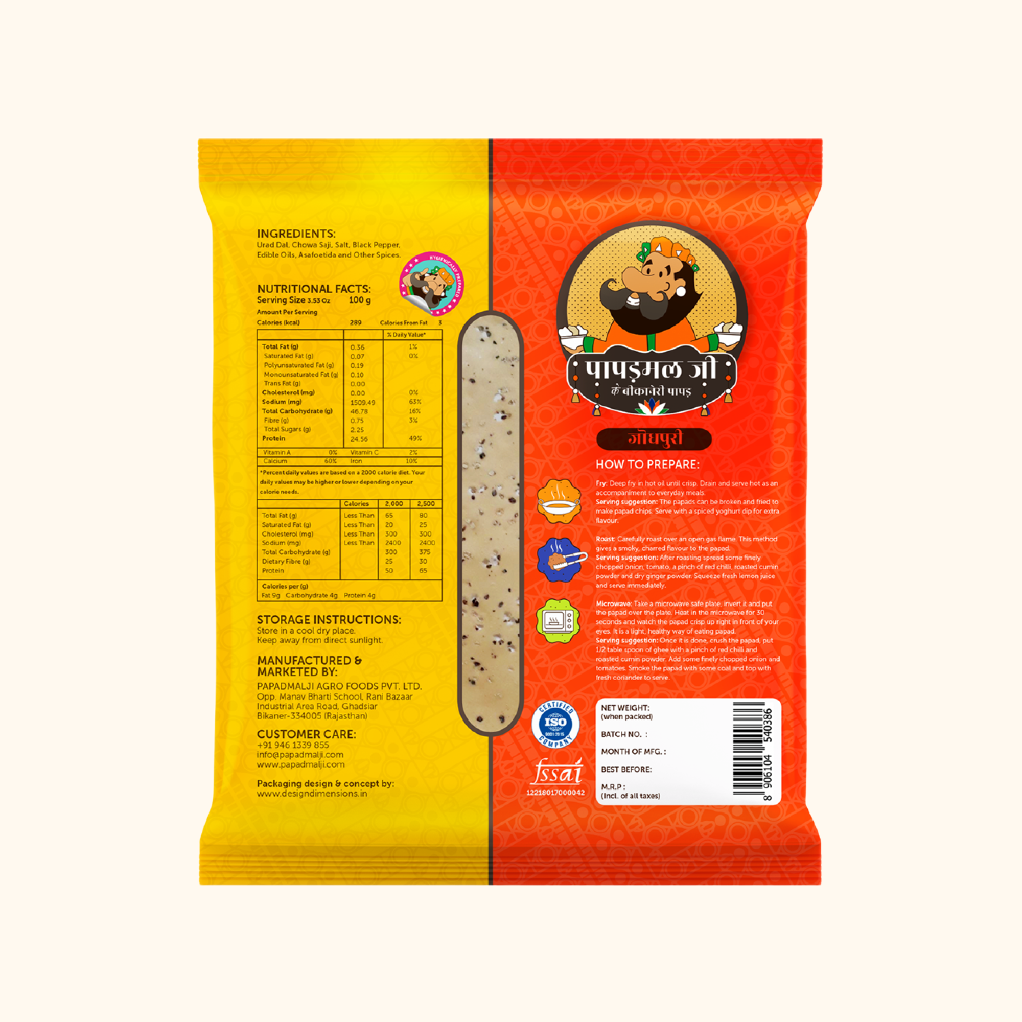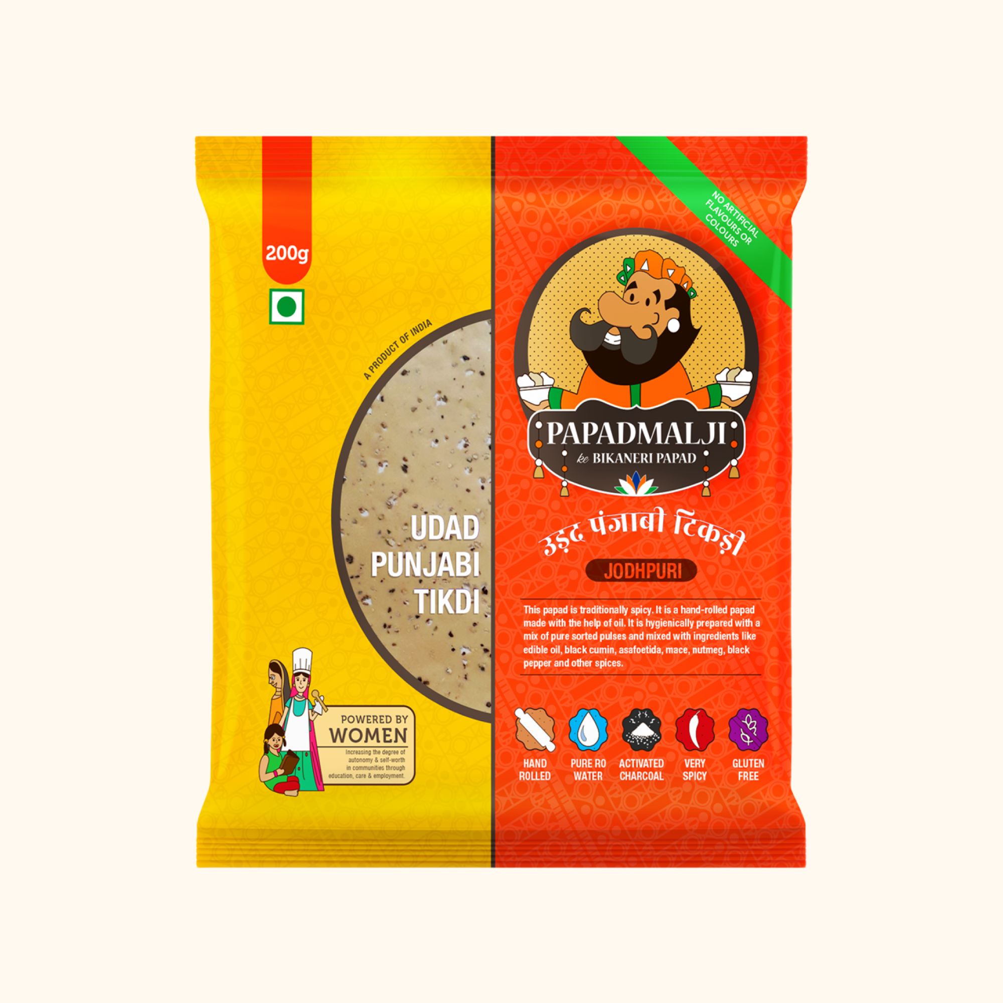 This papad is traditionally spicy. It is a hand-rolled papad made with the help of oil. It is hygienically prepared with a mix of pure sorted pulses and mixed with ingredients like edible oil, black cumin, asafoetida, mace, nutmeg, black pepper and other spices.